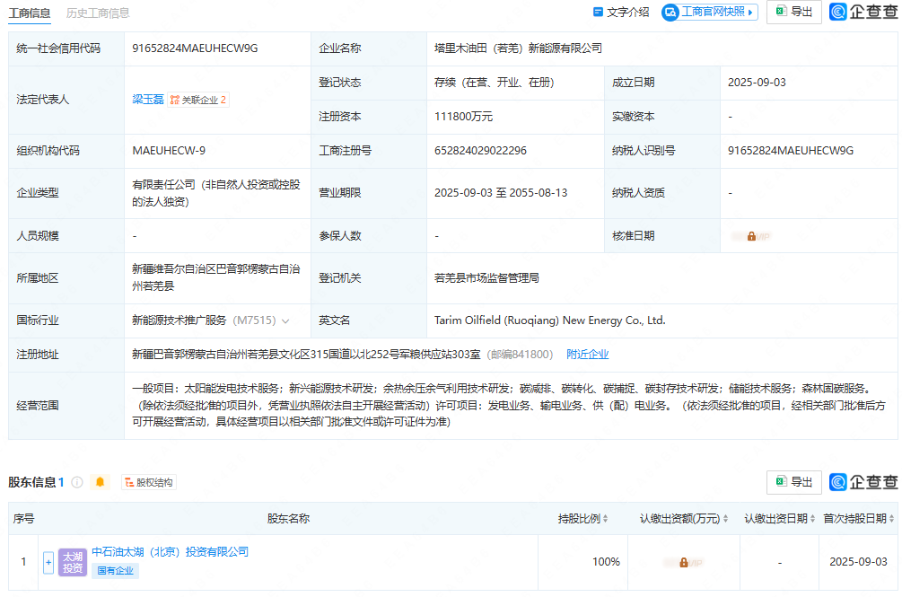 9月3日,塔里木油田新能源有限公司成立,法定代表人为梁玉磊,注册资本11.18亿人民币。
