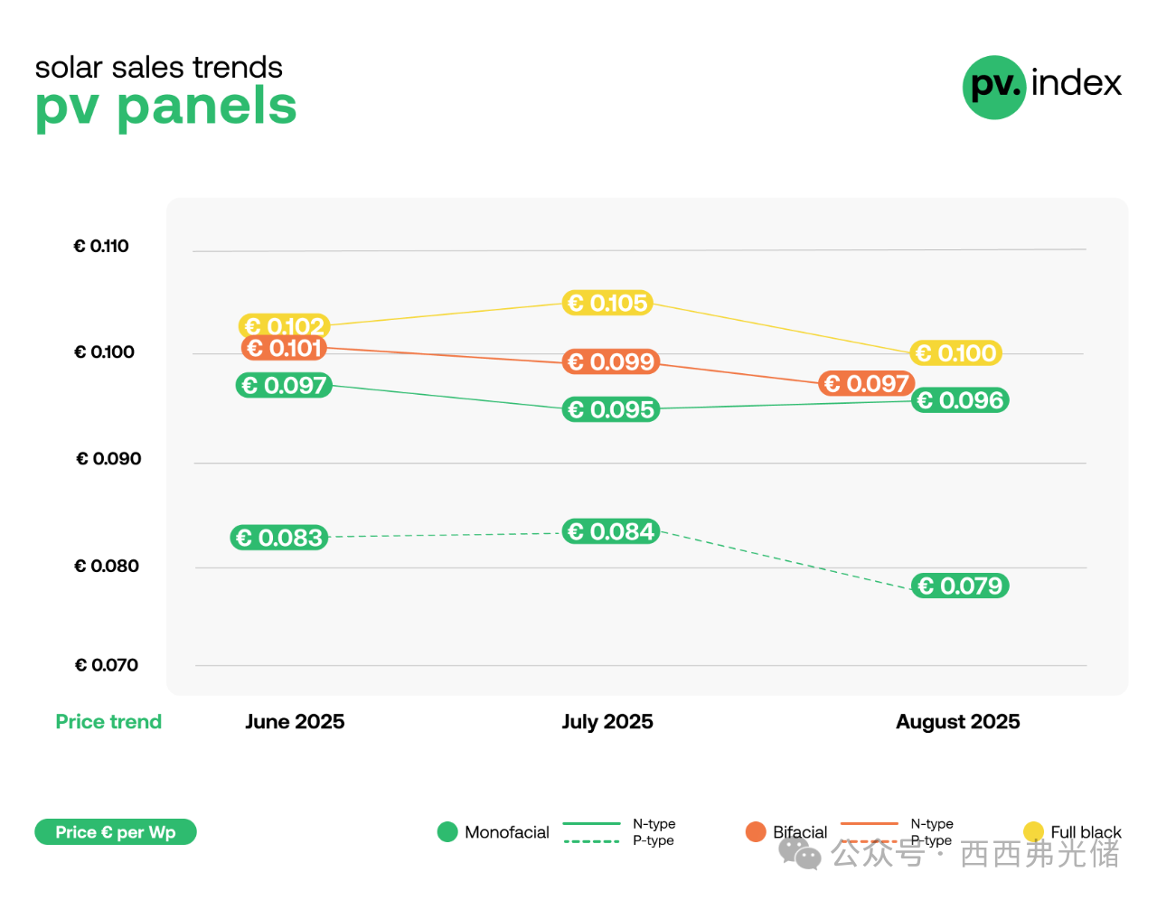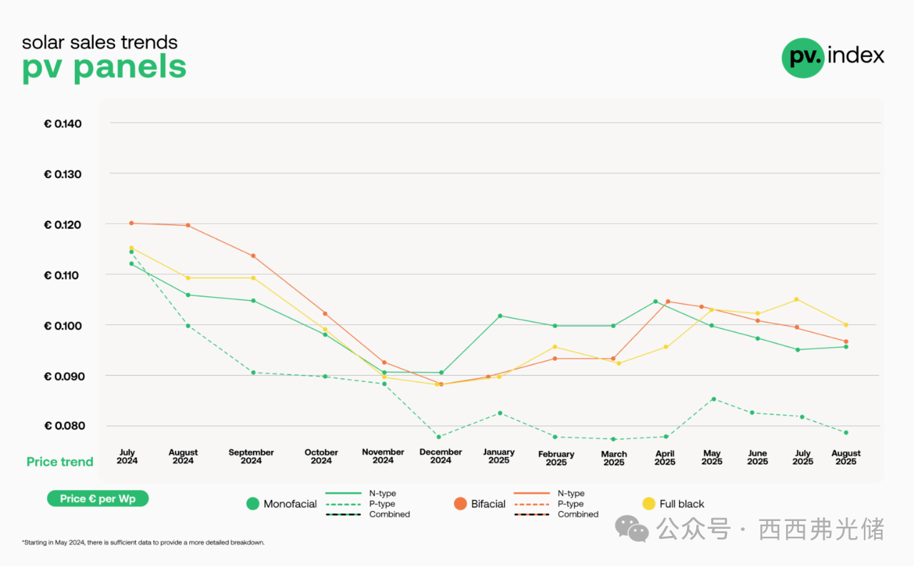 单面P型组件:价格大幅下跌6%,降至0.079欧元/瓦。这反映出P型技术正处于淘汰阶段,面临持续的价格压力,目前多作为低价库存进行销售。