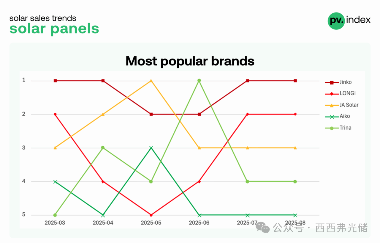 阳光电源 在中型住宅和工商业系统领域依然是强有力的竞争者。Fronius 尽管仍位居前五,但8月份的交易活动略有减少,反映出持续的供应限制。