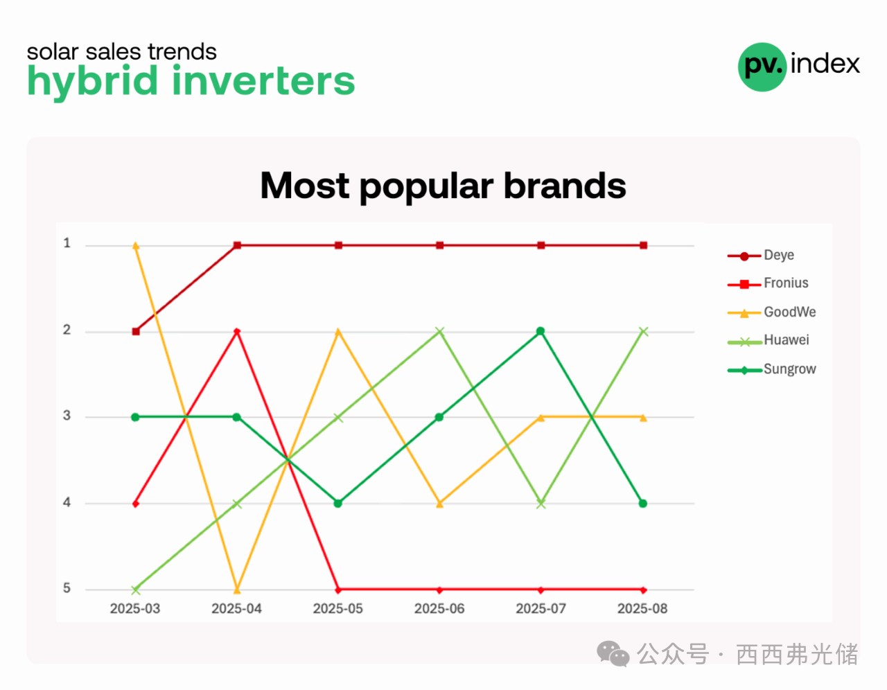 在混合逆变器市场,德业(Deye)凭借其性价比优势保持了明显领先。华为在该类别中也稳步攀升,加强了其跨细分市场的布局,而 固德威(GoodWe)和