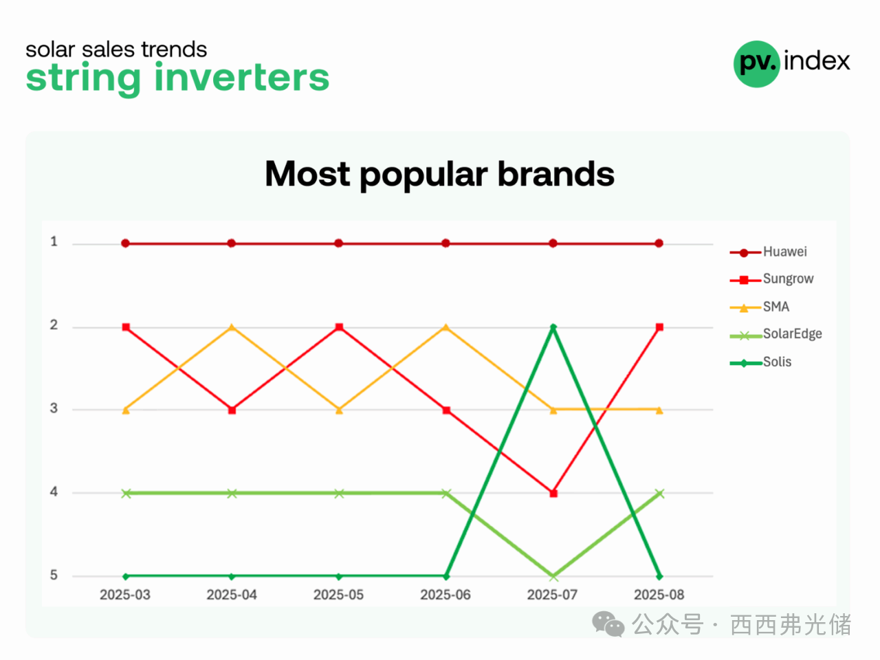SMA 紧随其后,由于在商业项目中的强劲需求而保持稳定地位,而 SolarEdge 和 Solis 占据了前五名的最后两个位置——其中 Solis