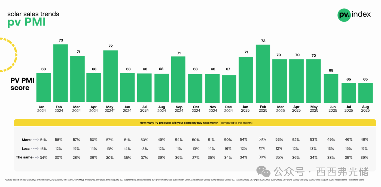 光伏采购经理人指数(PV PMI)8月维持在65,与7月持平,证实了历史性的低迷情绪。在接受调查的1321名 sun.store 用户中: