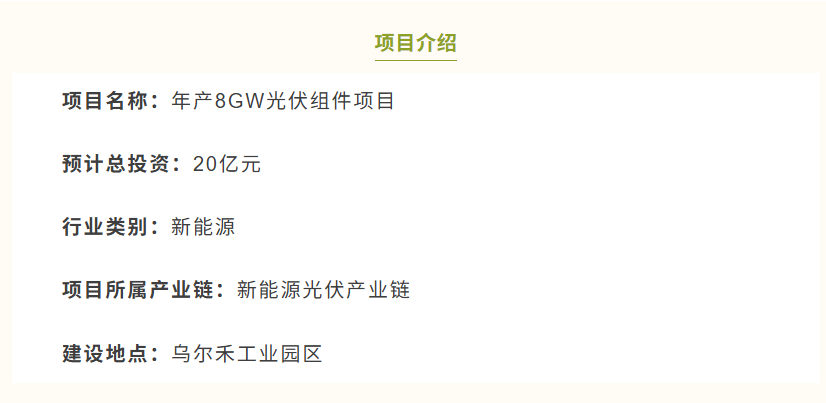 该项目建设地点位于新疆维吾尔自治区克拉玛依市乌尔禾工业园区,预计总投资20亿元,项目拟通过新建生产厂房及配套建筑设施,购置安装满足年产8GW高效单晶硅电池组件所需的生产设备、相应辅助配套设施设备、实验研发设施设备等。占地面积290亩。