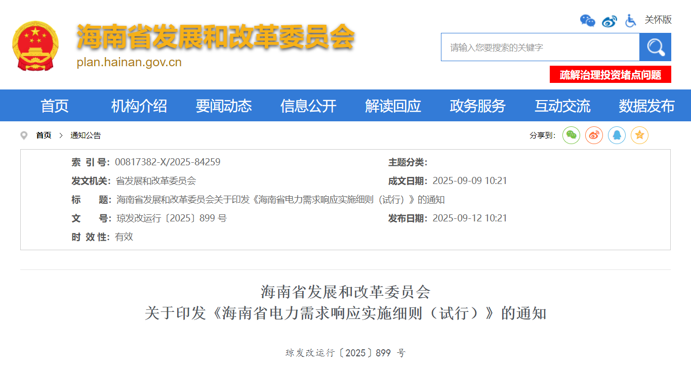 依据《电力负荷管理办法(2023 年版)》《电力需求侧管理办法(2023 年版)》等有关要求,为优化电力资源配置,深化电力负荷管理,提高电力系统灵活性,保障我省电力供需平衡,促进可再生能源电力消纳,结合我省实际,我委组织编制了《海南省电力需求响应实施细则(试行)》,现印发你们,请遵照执行。