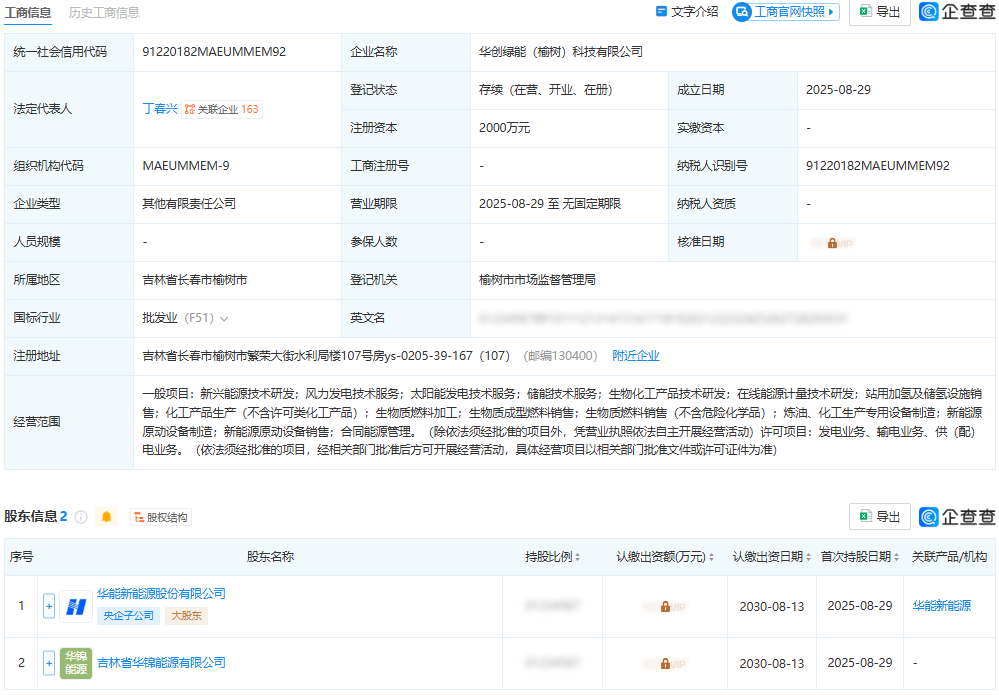 近日,华创绿能(榆树)科技有限公司成立,法定代表人为丁春兴,注册资本2000万元。