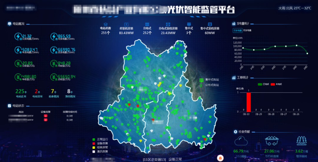 平台通过逆变器通讯棒,实时采集每座电站的发电功率、电压、电流,甚至组件温度、光照强度这些细节数据,然后用大数据算法分析运行趋势。比如某个逆变器的输出功率突然下降,系统会自动对比历史数据和同区域其他电站数据,判断是光照变化还是设备故障 —— 要是故障,立刻弹窗报警,同时把故障位置、可能原因推送给就近驻点人员。