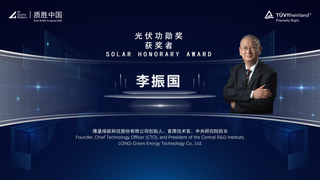 9月24日,在德国莱茵TÜV集团(以下简称“TÜV莱茵”)主办的2025“质胜中国”光储盛典颁奖典礼上,隆基绿能创始人、首席技术官李振国凭借多年来在光伏行业的持续创新、产业引领以及对全球能源转型的卓越贡献,荣获TÜV莱茵授予的“光伏功勋奖”。据了解,这一奖项是TÜV莱茵优胜奖体系中的最高个人荣誉,旨在表彰对光伏行业产生深远影响的领军人物。