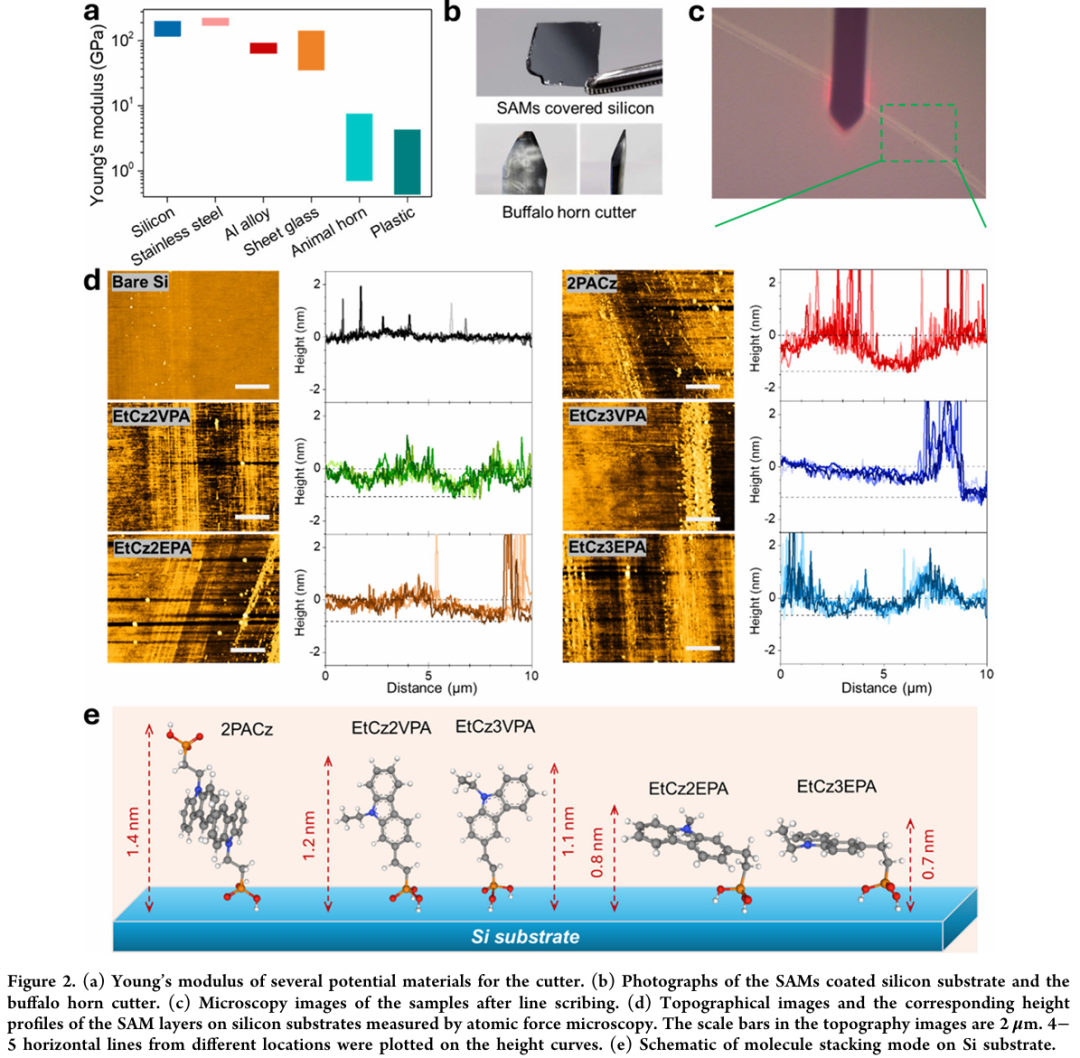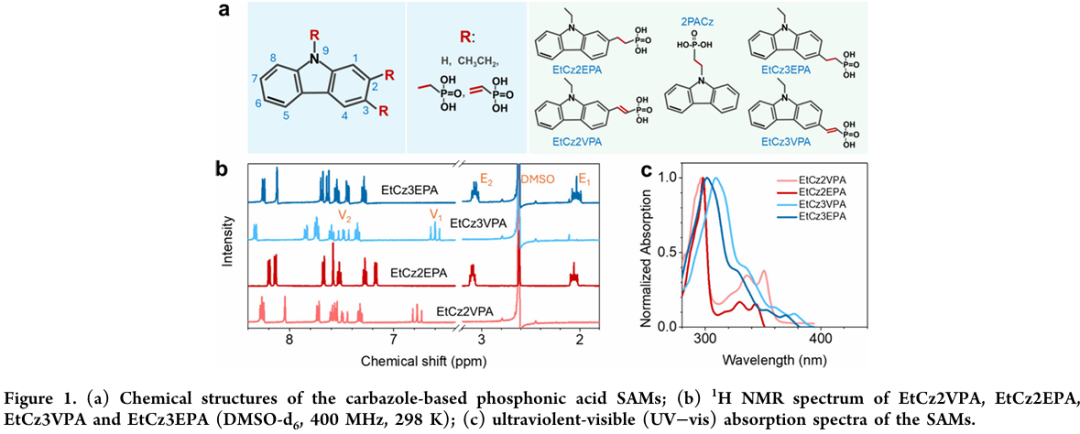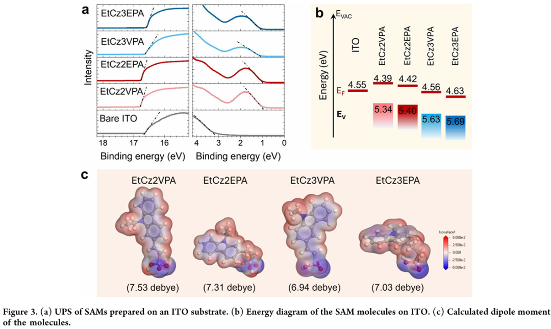 - 分子构型精准调控:通过将磷酸基团置于咔唑环的2位或3位,结合乙基/乙烯基连接基,实现了SAMs在基底上的面朝上或边朝上取向控制,乙基连接促进面朝上排列,形成更薄且更稳定的单分子层。
