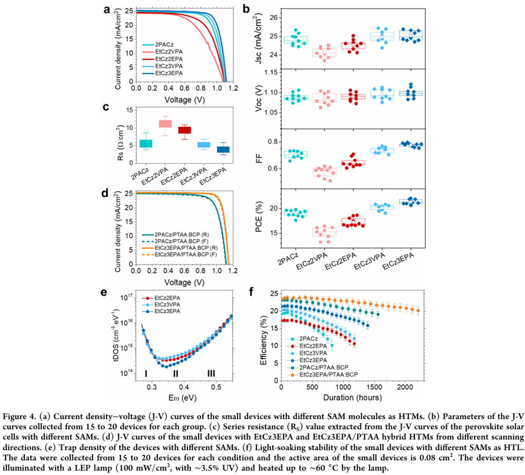 - 界面能级与电学性能优化:3位取代的SAMs具有更低的功函数,有效降低器件串联电阻,提升填充因子和短路电流密度,使基于EtCz3EPA的器件效率达21.37%,混合HTM器件效率达24.19%。