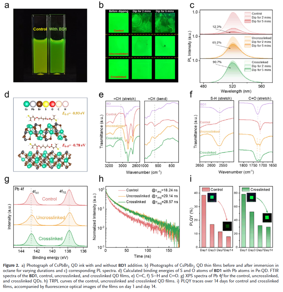 这些发现将BD1定位为一种高效的多功能添加剂,用于稳定和优化Pe-QD墨水,为高分辨率全彩Pe-QLED显示器及其他印刷光电器件的规模化生产铺平道路。