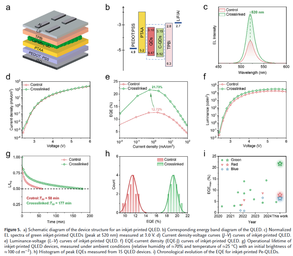 - 创纪录器件效率:喷墨打印绿光Pe-QLED实现21.73%的EQE与30637 cd m⁻²的亮度,为当前报道最高值。