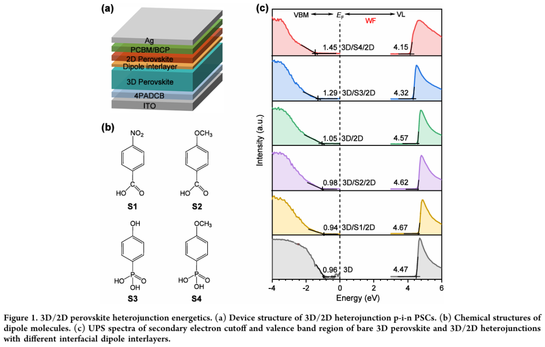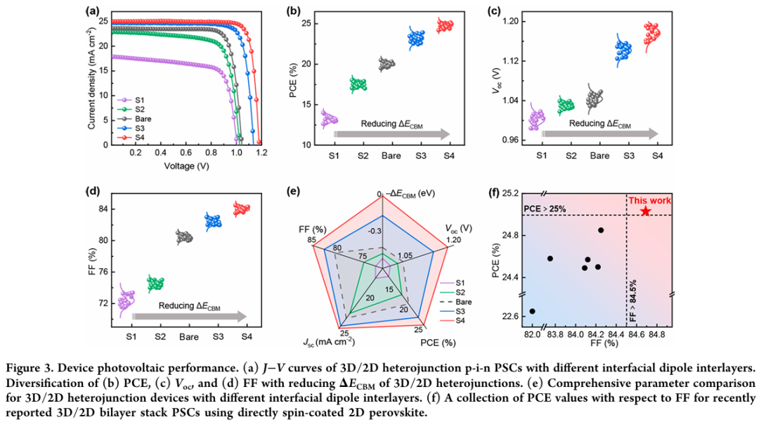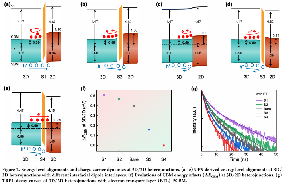 - 能带精准调控:通过引入不同偶极分子中间层,系统调控3D/2D界面能带对齐,负偶极层S4使导带偏移趋近于零,极大提升电子提取效率。