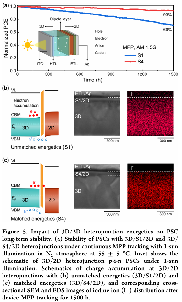 - 稳定性显著增强:能带匹配有效抑制电荷积累与卤素离子迁移,未封装器件在55°C、持续光照1500小时后仍保持93%的初始效率。
