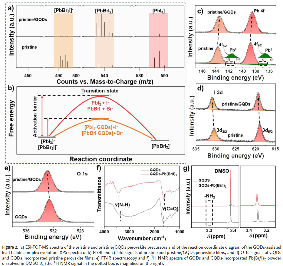 - GQDs实现成分重构与卤素均质化通过GQDs的强配位与氢键作用,打破碘/溴富集的铅卤络合物体系,促使前驱体中形成以[PbBrI₂]⁻为主的均匀组分,显著提升钙钛矿薄膜的成分均一性与发光纯度。