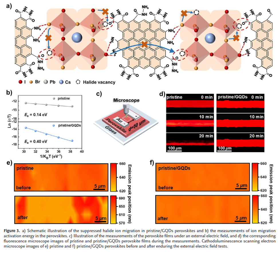 - 三重协同机制抑制卤素迁移GQDs通过卤素离子固定、迁移通道阻断及钙钛矿相空间隔离的协同作用,将离子迁移活化能从0.14 eV提升至0.40 eV,有效抑制电场下的卤素偏析与光谱漂移。