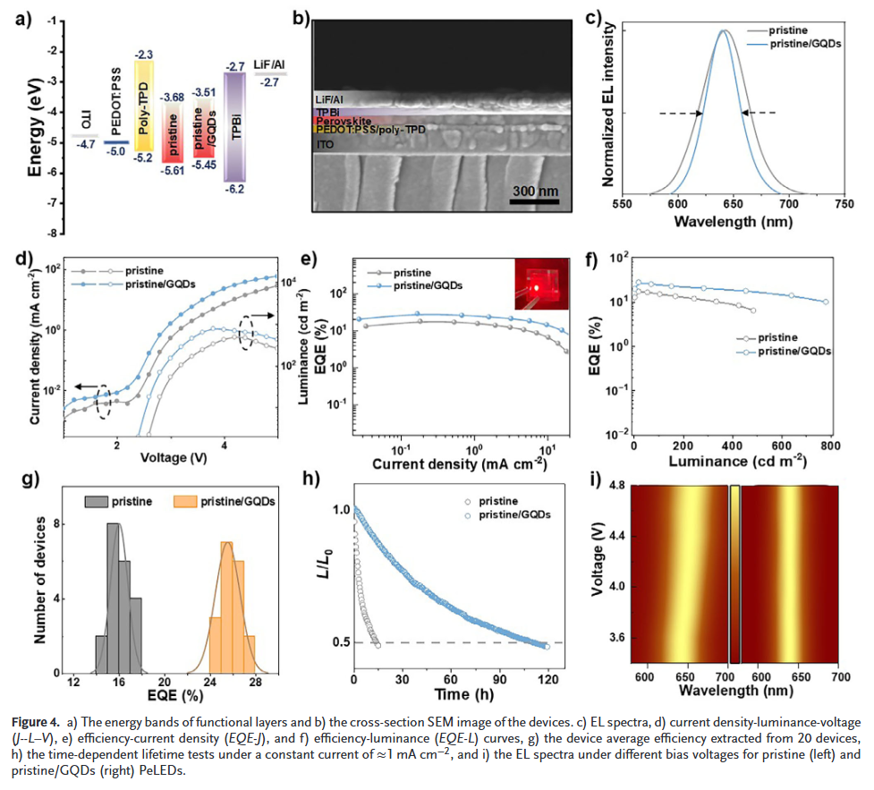 本文苏州大学任振伟和陈煜等人提出了一种创新方法,通过将多功能石墨烯量子点(GQDs)引入钙钛矿中来解决这些关键问题。我们揭示了GQDs通过成分重构、钙钛矿相隔离和卤化物离子固定等新机制,在实现均匀钙钛矿薄膜和抑制卤化物离子迁移方面发挥独特协同作用,并阐明了GQDs与钙钛矿之间形成强配位和氢键相互作用。结果表明,我们成功制备出高性能纯红色PeLEDs,其在外量子效率高达27.9%、发射波长640 nm且半高宽窄,器件寿命显著达110.3小时,且在测试过程中电致发光光谱保持稳定,代表了目前性能最佳的纯红色PeLEDs之一。