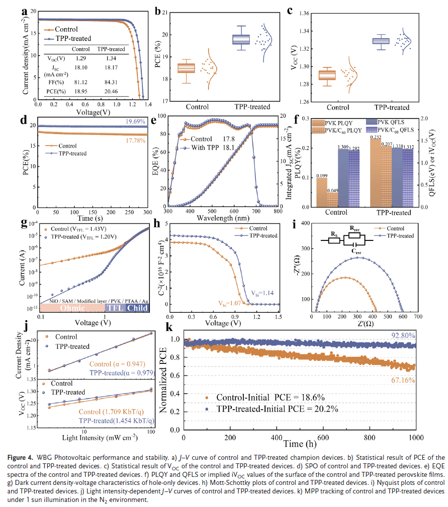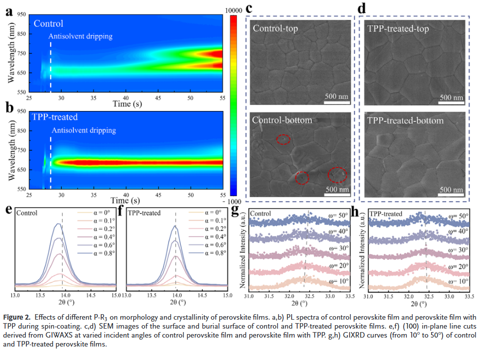 本文中国科学院大学刘畅等人提出了一种利用可控路易斯碱小分子改善Me-4PACz/钙钛矿界面的策略,有效抑制界面缺陷并促进高质量钙钛矿结晶。理论与实验结果表明,优化后的三(2-吡啶基)膦分子能够同时填补Me-4PACz自组装层缺陷、钝化钙钛矿底部未配位的Pb²⁺,并锚定[PbX₆]⁴⁻提供成核位点,诱导自下而上的均匀结晶。经TPP处理的单结电池在1.77 eV带隙下实现了20.46%的光电转换效率和1.34 V的高开路电压,是该带隙范围内报道的最高效率之一。