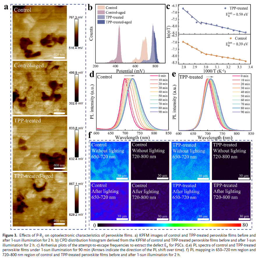 - TPP分子实现三重界面优化:通过TPP分子在Me-4PACz/钙钛矿界面处填补缺陷、钝化Pb²⁺、锚定[PbX₆]⁴⁻结构,同步实现缺陷抑制、结晶引导与离子迁移抑制。