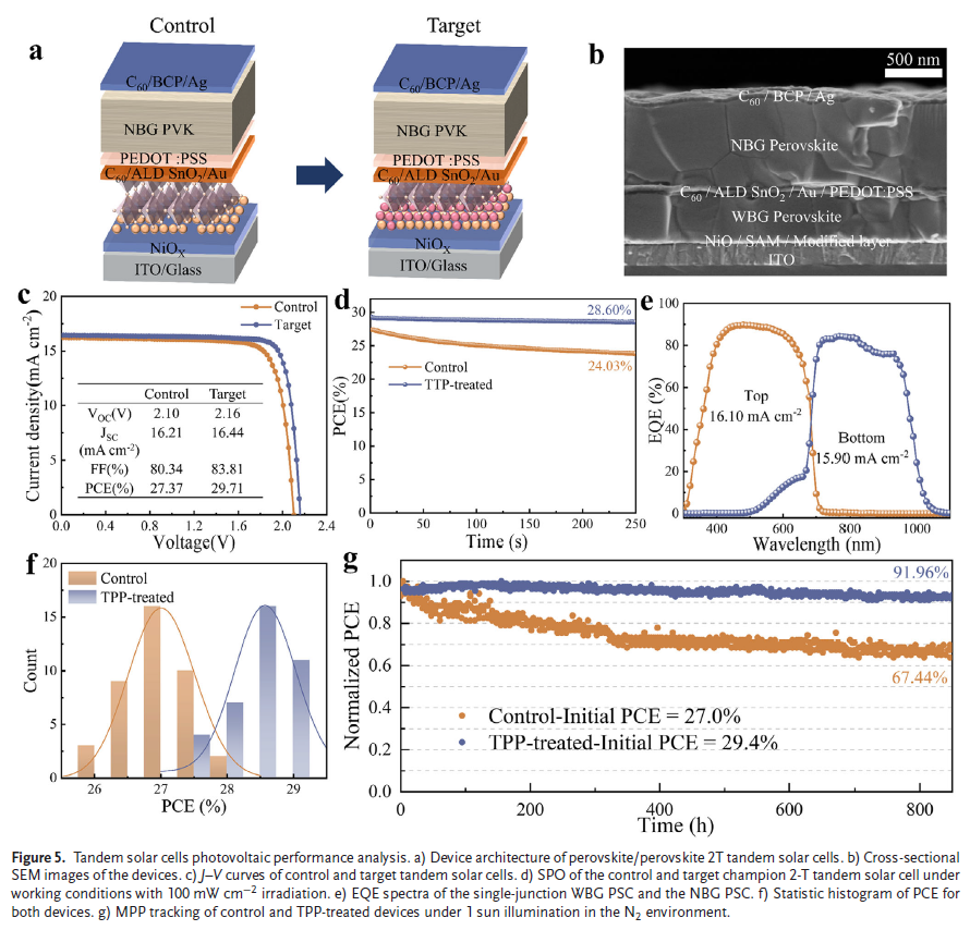 - 全钙钛矿叠层效率与稳定性双高:叠层电池效率达29.71%,并具备优异的光稳定性,在850小时MPP跟踪后仍保持91.96% 的初始效率。