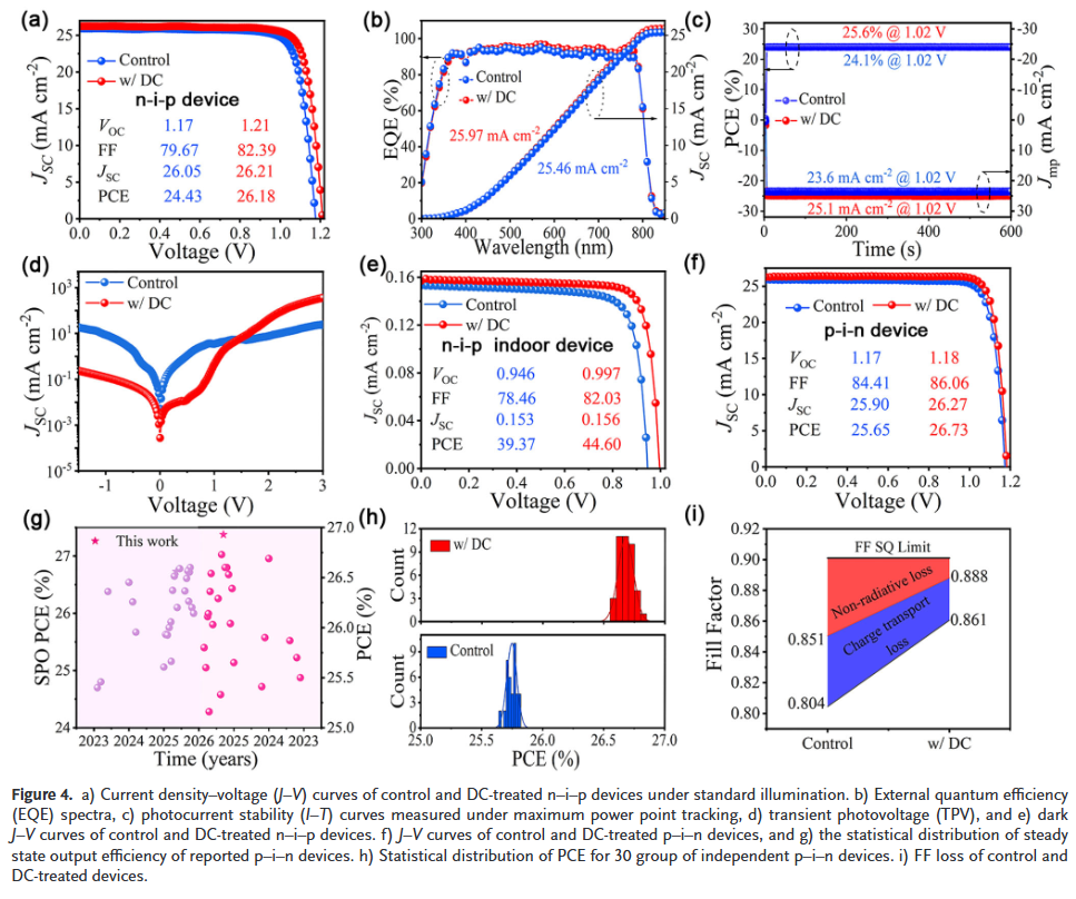 - 创纪录的认证效率与室内光性能p-i-n结构器件认证准稳态效率达26.73%,为目前最高之一;n-i-p结构在室内弱光下效率高达44.60%,展示出卓越的多场景适用性。
