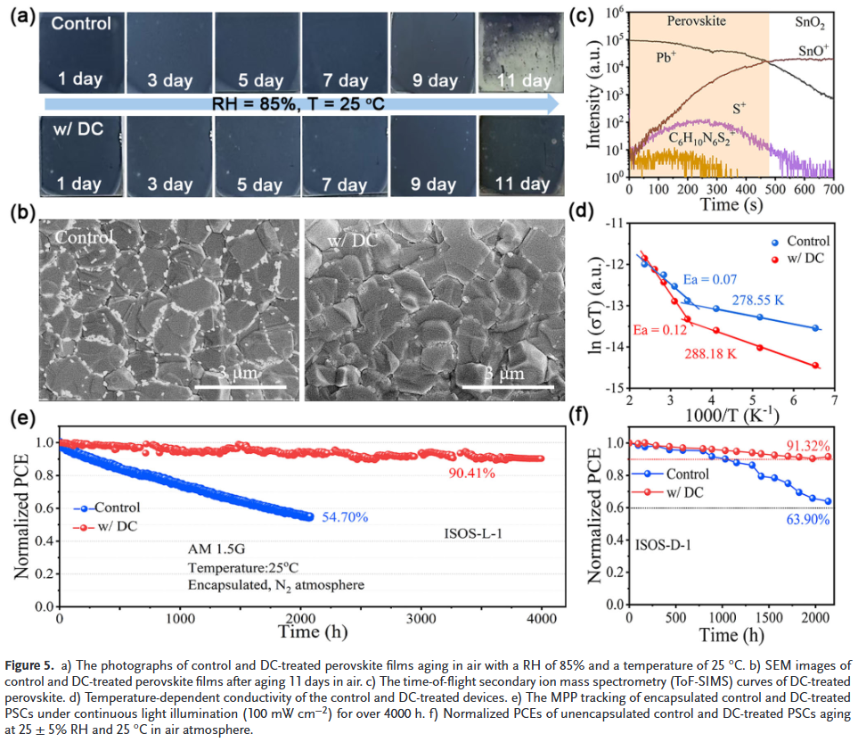 - 超强稳定性:光照4000小时效率保持>90%器件在连续光照(ISOS-L-1)4000小时和暗存储(ISOS-D-1)2000小时后,效率衰减极小,薄膜在高温湿环境中11天仍保持黑色相,稳定性突出。