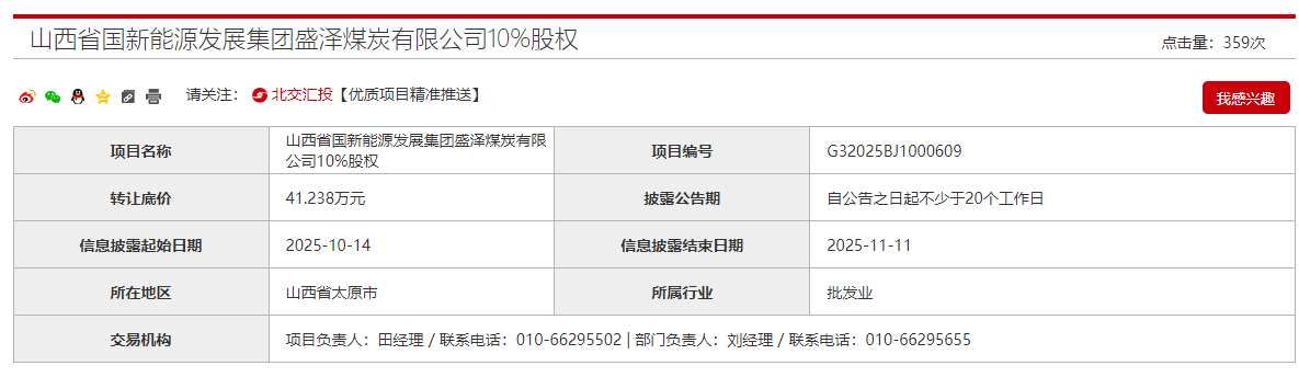 10月14日,中国国家铁路集团旗下山西先行经贸有限公司转让旗下山西省国新能源发展集团盛泽煤炭有限公司10%股权,转让底价41.238万元。