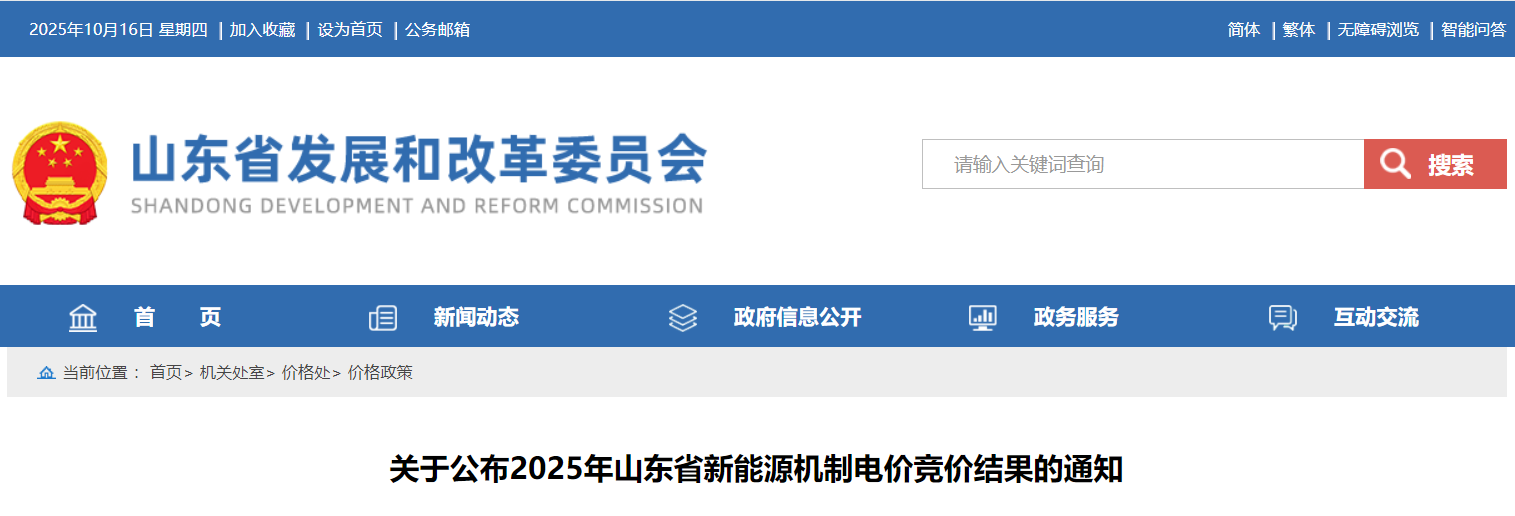 根据《山东省新能源上网电价市场化改革实施方案》(鲁发改价格〔2025〕576号)、《关于印发山东省新能源机制电价竞价实施细则的通知》(鲁发改价格〔2025〕577号)、《关于2025年新能源机制电价竞价工作有关事项的通知》(鲁发改价格〔2025〕578号)等文件规定,我省组织开展了2025年新能源机制电价竞价工作。现将竞价结果及有关事项通知如下: