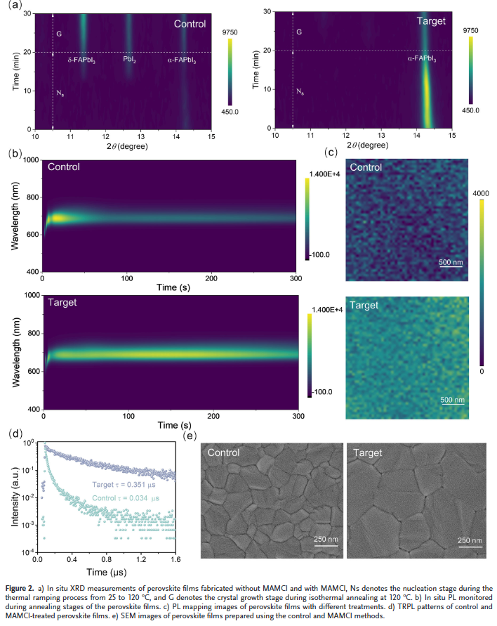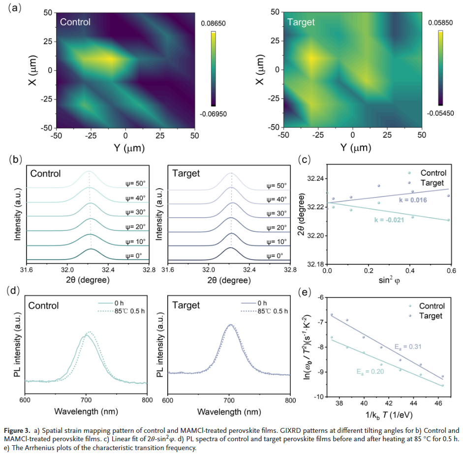 - 双功能配体MAMCI实现晶向与应变协同调控:通过双齿配位机制诱导(100)择优取向结晶,并在晶界动态锚定,同步释放晶格应变,提升薄膜质量与稳定性。