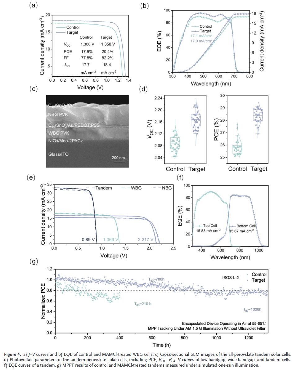 - 优异操作稳定性:叠层器件在连续光照MPPT测试中T80寿命超过1320小时,展现出良好的商业化潜力。