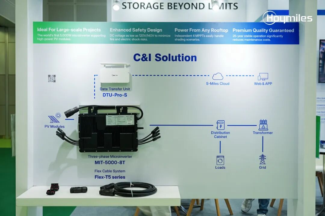 在储能领域,禾迈重点展示了户储与工商储两大产品线。三相低压HIT系列与LB电池协同工作,构建一套集绿色发电、能源储存与智能调度于一体的高效能源管理系统。系统全EPS(应急电源)支持全屋备用电源,具备50A旁路电流;实现毫秒级不间断电源,零感知电力切换。