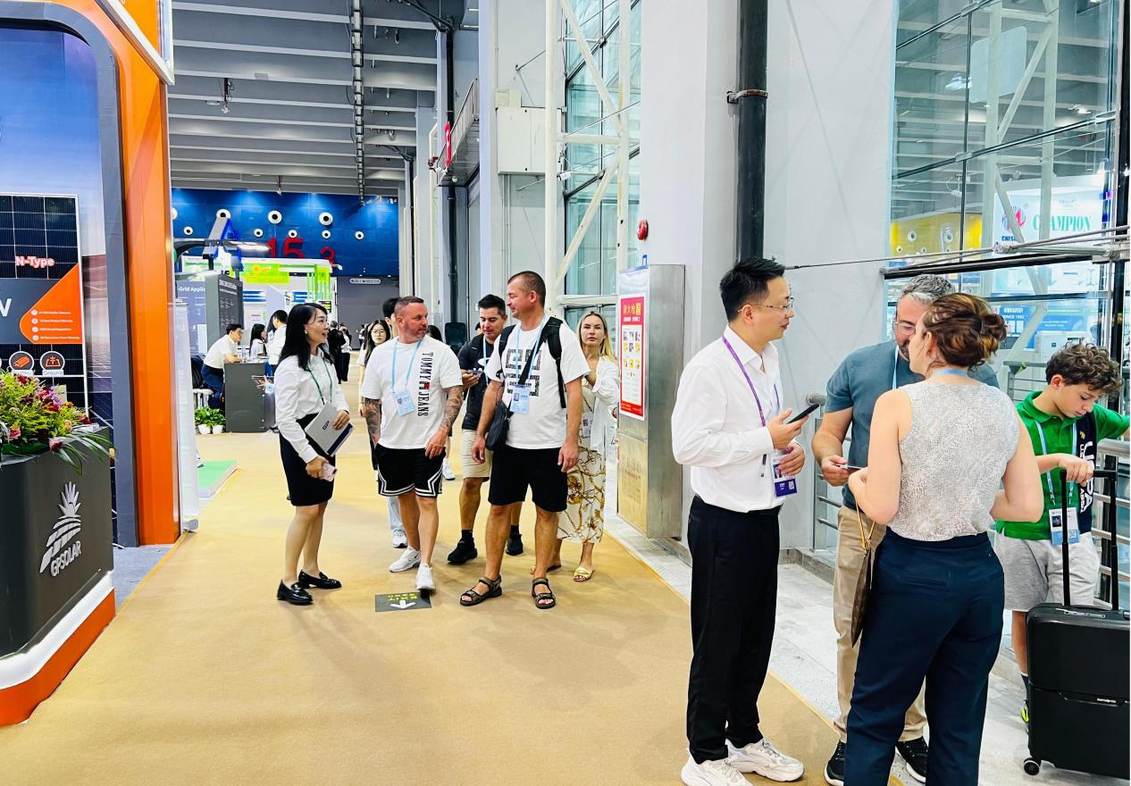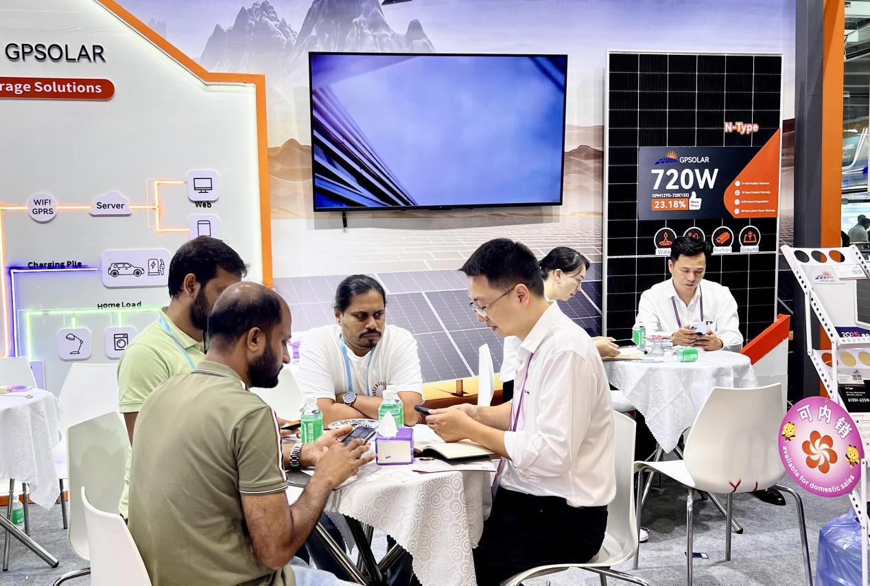 在格普光能展台前,来自泰国的光伏工程商正详细咨询 TOPCon 635W 组件的批量供货周期,该组件具备更低的温度系数,适配极端高温气候条件,已在东南亚、非洲等地多个项目中实现稳定应用。组件表面采用特殊涂层工艺,纳米多孔结构可有效提升透射比(2-2.5%),同时灰尘不容易附着表面,减少光线遮挡。有效抑制功率衰减、延长电站生命周期、降低客户运维成本。另外,格普光能720W组件则以大功率、灵活的安装适配性吸引了意大利、德国等采购商的重点关注。