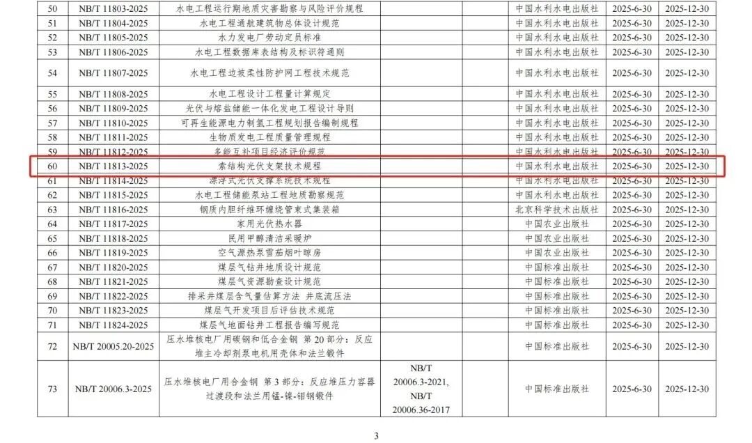 作为国内首个覆盖索结构光伏支架全流程的行业技术标准,《索结构光伏支架技术规程》(NB/T11813-2025,以下简称“规程”)已于2025年6月30日由国家能源局正式批准发布,将于2025年12月30日开始实施。