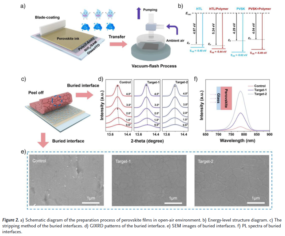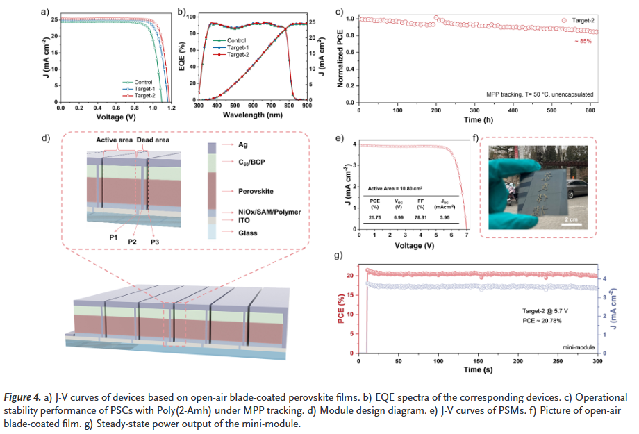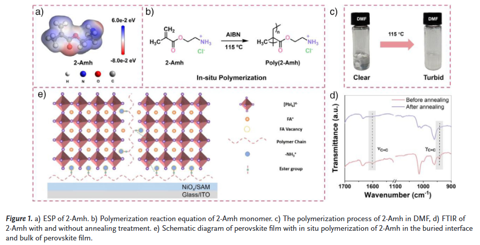 - 原位聚合双功能设计:利用2-Amh单体在热退火过程中同步构建底部界面层与体相聚合物网络,协同调控结晶、钝化缺陷,显著提升薄膜质量与器件性能。