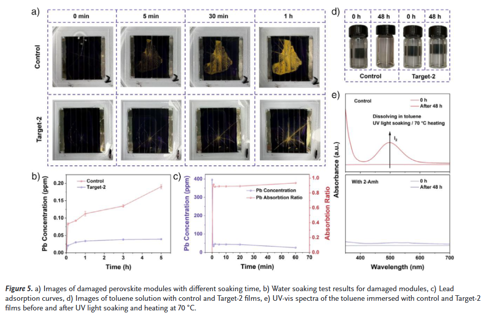 - 环境友好与稳定性增强:聚合物网络有效螯合铅离子,将受损器件的铅泄漏率降低约6倍,同时抑制I₂生成,显著提升器件的环境安全性与长期稳定性。