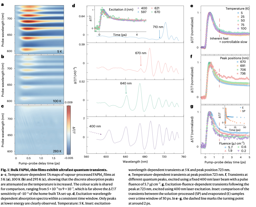 - 发现皮秒级量子瞬态过程:在块体FAPbI₃薄膜中观测到约2皮秒的超快量子衰减过程,源于纳米畴超晶格中的量子隧穿,为钙钛矿在超快量子器件中的应用奠定基础。