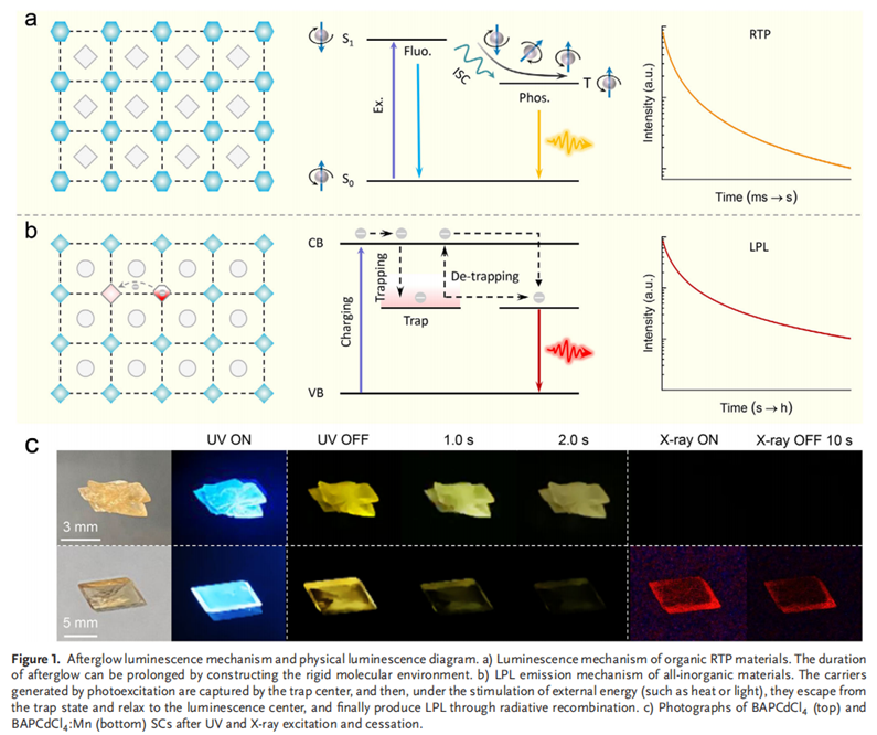 具有室温磷光(RTP)与长余辉发光(LPL)特性的有机及有机–无机杂化材料,因其在时间分辨光学与信息加密等领域的广阔应用前景而备受关注。然而,在单一材料体系中实现可本征区分的RTP与LPL发射仍是一项尚未解决的关键科学问题,其突破对于发展多维光学加密及智能光电功能器件具有重要意义。