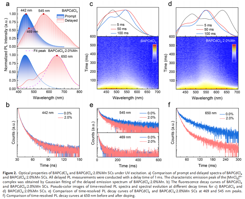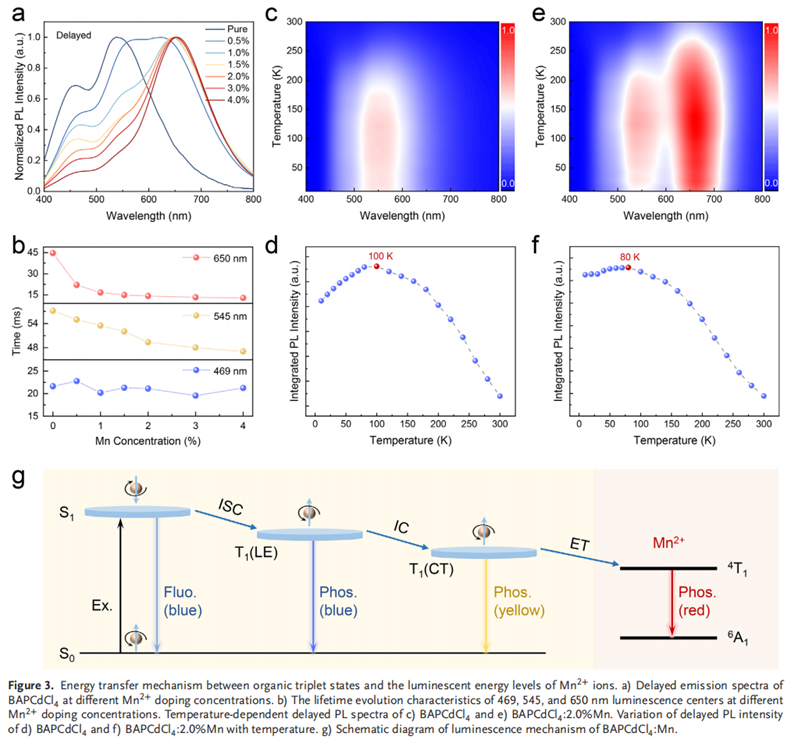 1、能量转移调控室温磷光寿命:通过在室温磷光材料BAPCdCl4中引入Mn2+离子,构建了从有机配体三重态向Mn2+的4T1能级的高效能量转移通道,在保留基体于紫外激发下蓝光发射特性的同时,实现了对RTP寿命的精确可控调节。
