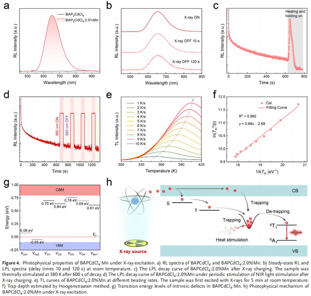 2、离子掺杂诱导X射线下长余辉发射:Mn2+掺杂有效引入能级陷阱,并与氯空位形成协同耦合,从而显著提升载流子的俘获与释放效率,实现了在X射线激发下超过600 s的红色超长余辉发射。