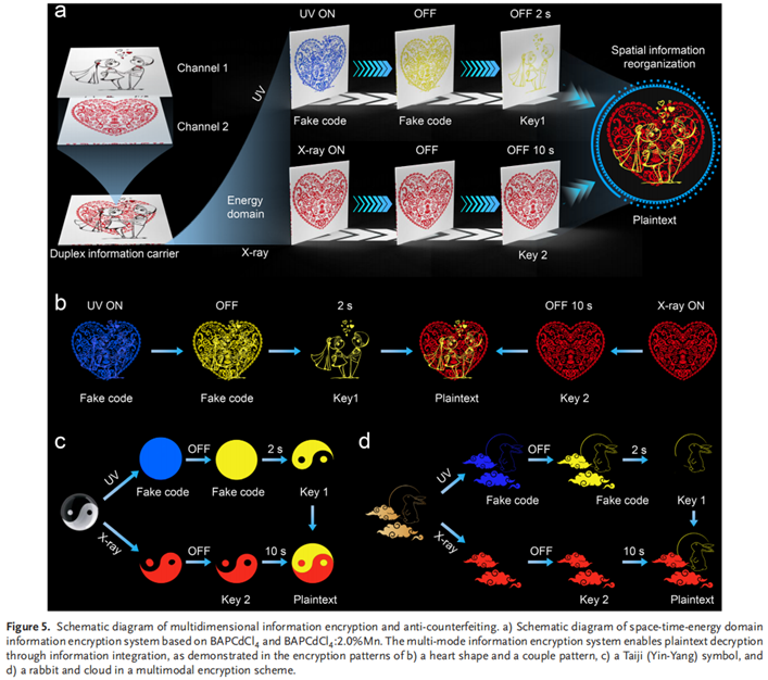 3、多维防伪应用实现:基于激发依赖的发光差异,构建了集时间、空间与能量编码于一体的多维光学加密系统,展现出在高安全防伪与信息存储领域的应用潜力。