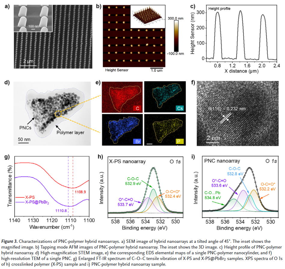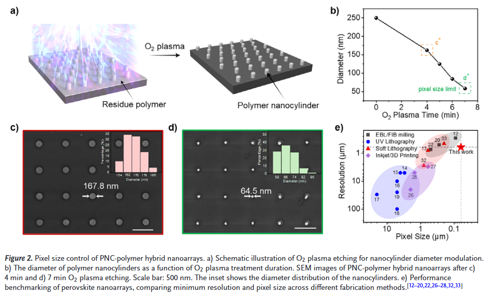 本研究福州大学杨黄浩、复旦大学Yihui Sang和聂志鸿等人提出一种聚合物模板原位生长策略,用于制备具有超小像素尺寸和优异环境稳定性的厘米级钙钛矿纳米晶阵列。该方法通过纳米压印软光刻技术制备交联聚合物阵列,随后在聚合物纳米域内实现钙钛矿纳米晶的选择性成核与生长。所获得的纳米晶阵列像素分辨率高达59,325 ppi。通过调控聚合物纳米柱的尺寸,像素尺寸可在167.8至64.5 nm之间精确调节,突破了目前报道的像素尺寸极限。此外,该纳米阵列表现出卓越的稳定性:在水中浸泡超过1000小时后仍保持91.8%的初始光致发光强度;在30–100°C之间进行10次热循环后保留86%的初始发光强度;在6.5小时紫外光照射后几乎保持100%的初始发光强度。最后,我们展示了该钙钛矿纳米晶阵列作为X射线成像闪烁体的应用。