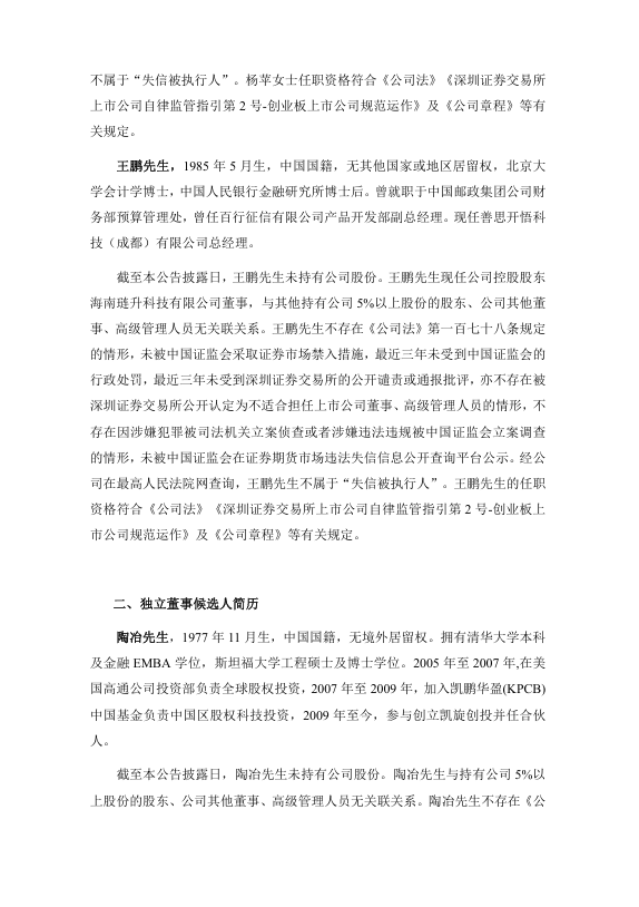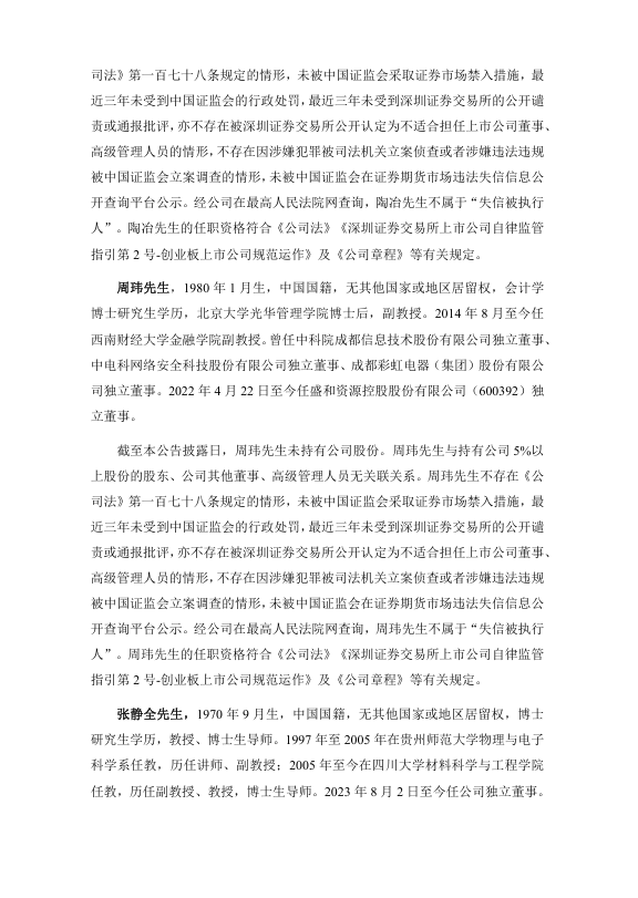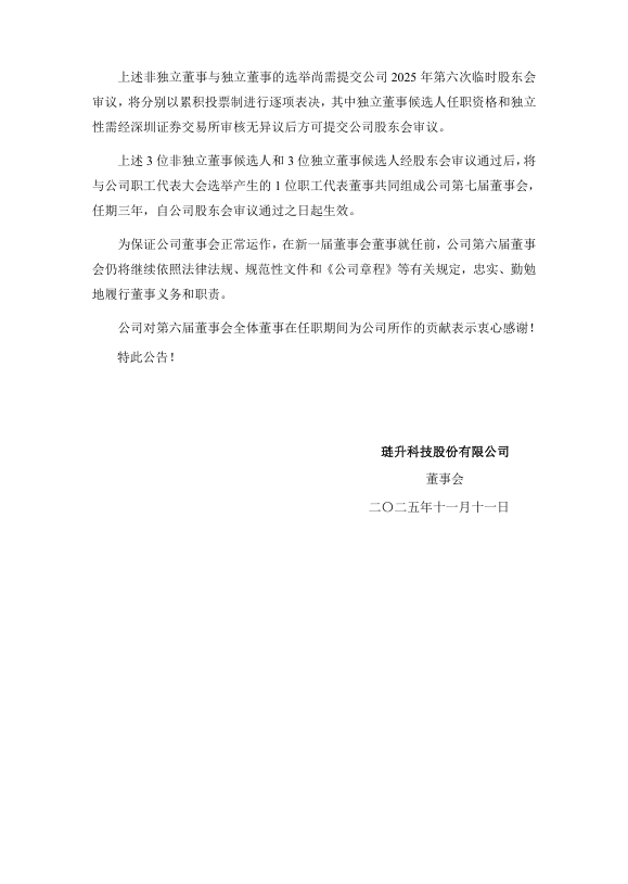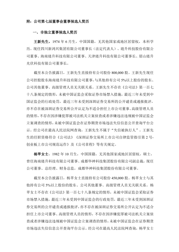 近日,琏升科技(300051.SZ)发布关于董事会换届选举的公告。根据公告,第七届董事会由7人组成,非独立董事候选人包括控股股东关联方代表王新、公司现任管理层核心杨苹及财务专家王鹏,其中王鹏为北大会计学博士、央行金融研究所博士后,具备丰富财务管控经验。独立董事候选人同样亮眼,涵盖凯旋创投合伙人陶冶、西南财大副教授周玮及川大教授张静全,覆盖资本运作、会计监管及光伏技术领域。公告特别提及,陶冶尚未取得独董资格证书但已承诺参训取证。