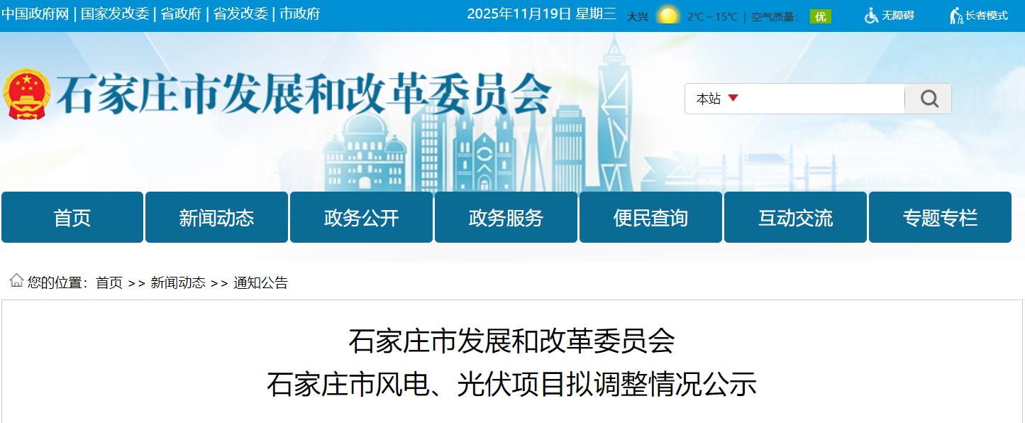 11月18日,石家庄市发改委发布《石家庄市风电、光伏项目拟调整情况公示》,对2025年底到期项目、储备库项目和资源开发协议情况进行了摸底,并结合企业投资积极性、土地资源落实情况、项目前期手续办理及施工进度等研究提出了处置意见。