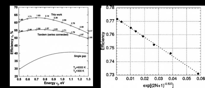 图2 (a) 全聚光条件下效率[3]; (b) 考虑无限多IB时极限效率[6]
