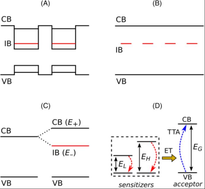 该技术是在体半导体中通过引入深能级杂质构建IB[17]。这些深能级位于VB和CB之间,可以吸收低能光子,从而在理论上提升太阳电池效率。