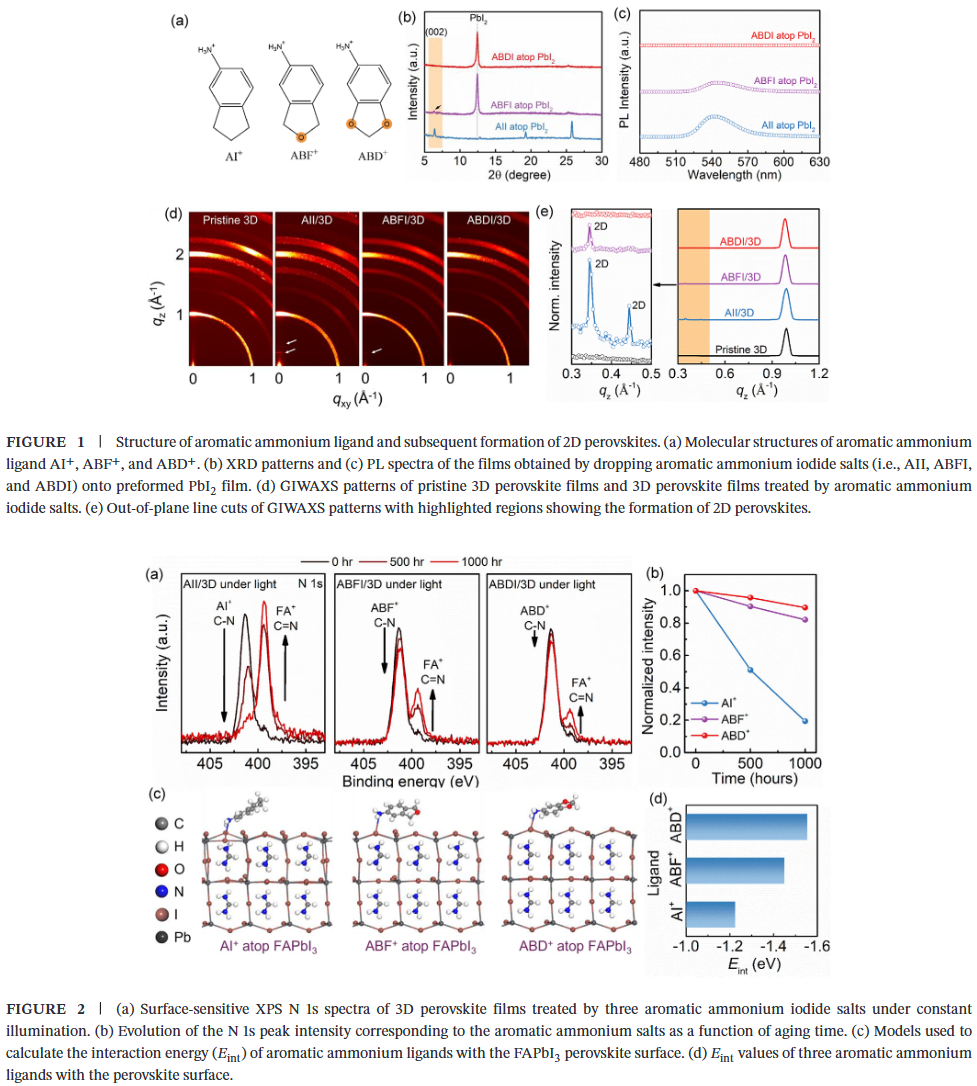 - 配体吸电子能力调控界面稳定性:通过杂环中氧原子数量的增加,系统调控芳香铵配体的吸电子能力,最强吸电子配体ABDI有效抑制2D相形成并阻止离子互扩散。