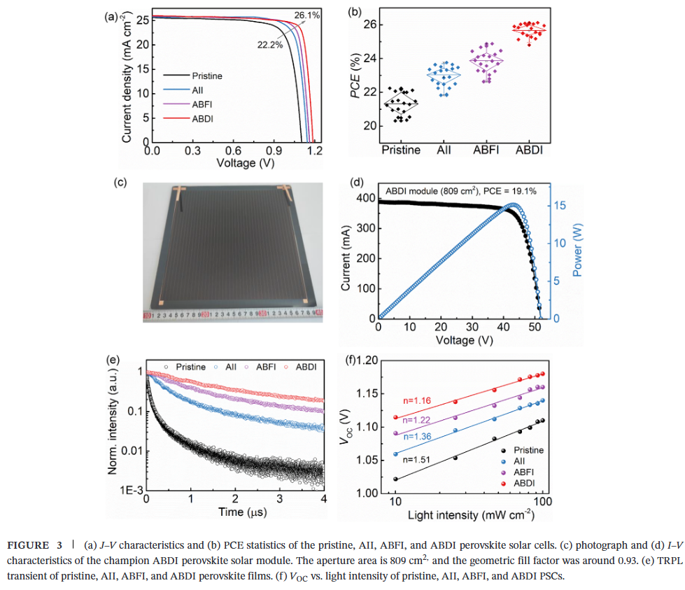 - 高效且可扩展的器件性能:在0.16 cm²小面积电池中实现26.1%的效率,在809 cm²大面积组件中实现19.1%的效率,展现出优异的可扩展性。