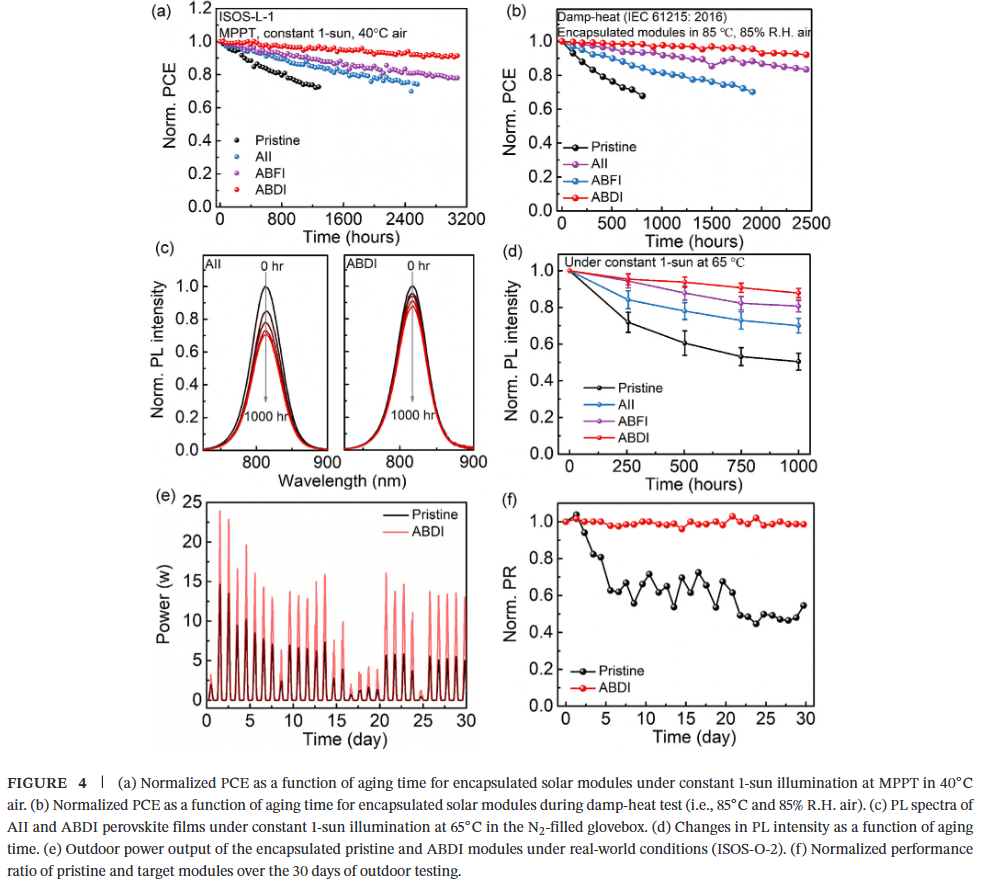 封装后的组件表现出优异的湿热稳定性(85°C/85%相对湿度)和运行耐久性,分别在2500小时和3000小时后效率损失小于10%。此外,组件在30天户外运行中保持稳定的功率输出,显示出其在实际应用中的潜力。