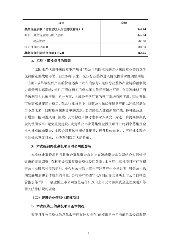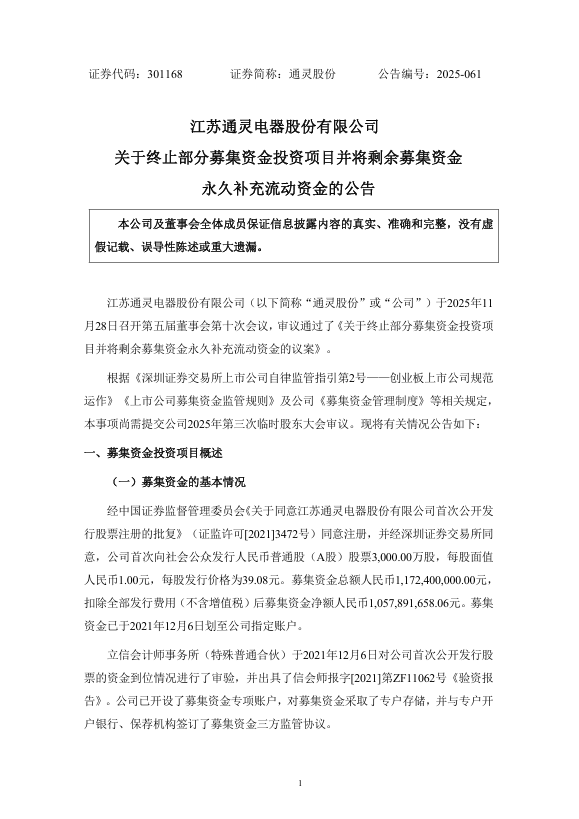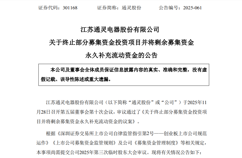 近日,通灵股份(301168.SZ)发布公告,公司董事会审议通过决议,终止“太阳能光伏组件接线盒生产项目”,并将剩余募集资金永久补充流动资金。
