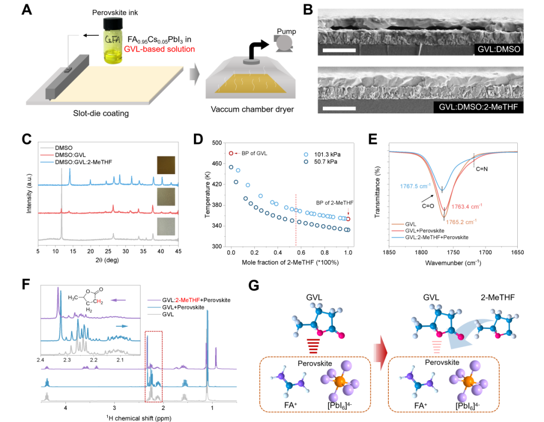 图1. 采用GVL/DMSO/2-MeTHF混合溶剂体系制备钙钛矿薄膜。(A)狭缝涂布法和VCD工艺大规模制备钙钛矿薄膜的过程。(B)钙钛矿薄膜横截面SEM图像。(C)VCD后的钙钛矿薄膜中间相对比。(D)GVL/2-MeTHF混合液的等压气液平衡图。(E和F)钙钛矿的FTIR光谱(E)和1H核磁共振谱(F)。(G)GVL和2-MeTHF与钙钛矿的配位结构示意图。
