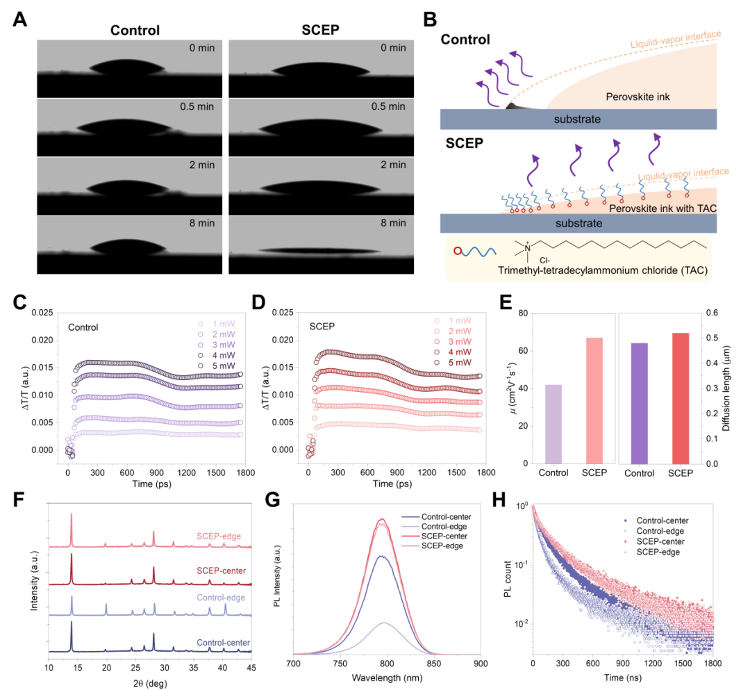 图2. 钙钛矿薄膜表征。(A)对照组与SCEP钙钛矿墨滴的接触角图像。(B)钙钛矿湿膜溶剂蒸发示意图。(C和D)基于太赫兹(THz)测量的对照组(C)与SCEP(D)钙钛矿薄膜载流子动力学。(E)基于太赫兹分析的对照组与SCEP钙钛矿薄膜迁移率(左)及扩散长度(右)。(F)XRD图谱,(G)稳态光致发光光谱,(H)对照组与SCEP钙钛矿薄膜中心与边缘区域的时间分辨光致发光曲线。